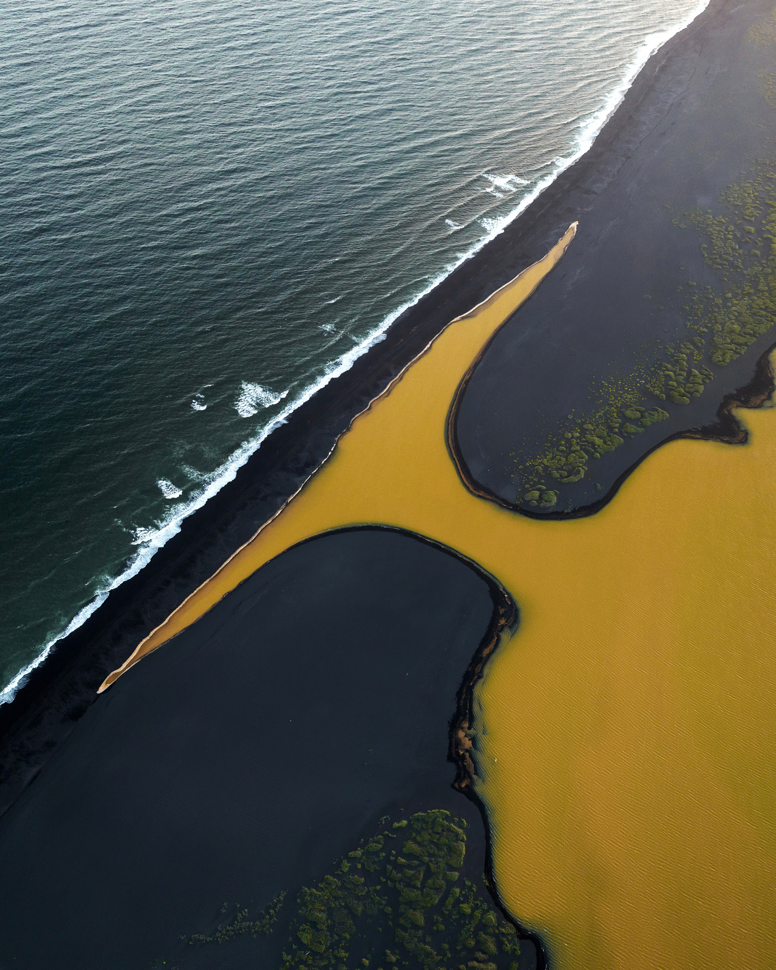May marks a powerful transition as winter loosens its hold on the landscape. Snowmelt feeds the glacial rivers, expanding them into intricate braided patterns across black sand plains. Sediment-rich glacial water merges with clear spring streams. Together, they create striking contrasts, colors, and flowing forms. From the air, these rivers resemble living abstract paintings.
